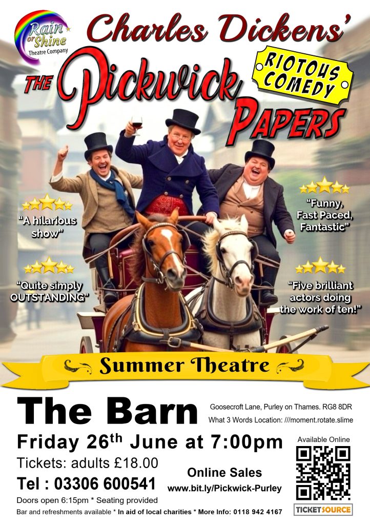 The Rain or Shine Theatre Company is coming back to the Barn, Goosecroft (RG8 8DR), on Friday 26th June 2026, with a performance of “The Pickwick Papers”.